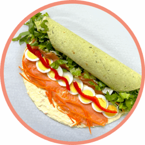 mehr Infos zum ProduktLachs Wrap1 Rolle | Wrap-Fladen (Weizentortillia) | Breuer Wrap-Salatmischung | Meerrettichfrischkäse, Räucherlachs, Karottenstifte, Ei, rote Paprika 1 roll | Wrap (wheat tortilla) | Breuer wrap salad mix | Horseradish cream-cheese, smoked salmon, carrot sticks, egg, red bell pepper