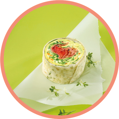 mehr Infos zum ProduktA Lachs Wrapini® | 1515 Stück | sortenrein | Wrap-Fladen (Weizentortilla) | W®-Salatmischung mit Ruccola Merrettichaufstrich, Räucherlachs, Ei, Karotten, Paprika